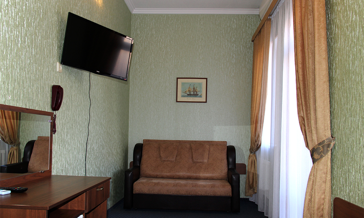 Одноместный номер стандарт представляет собой комфортабельную комнату площадью 14 кв. м., предназначенную для проживания одного человека. В номере полный санузел, телевизор, холодильник, кондиционер. Для удобства отдыхающих номер оснащен необходимой бытовой техникой и корпусной мебелью. Уборка номера ежедневно, смена полотенец раз в три дня, смена постельного белья раз в пять дней.